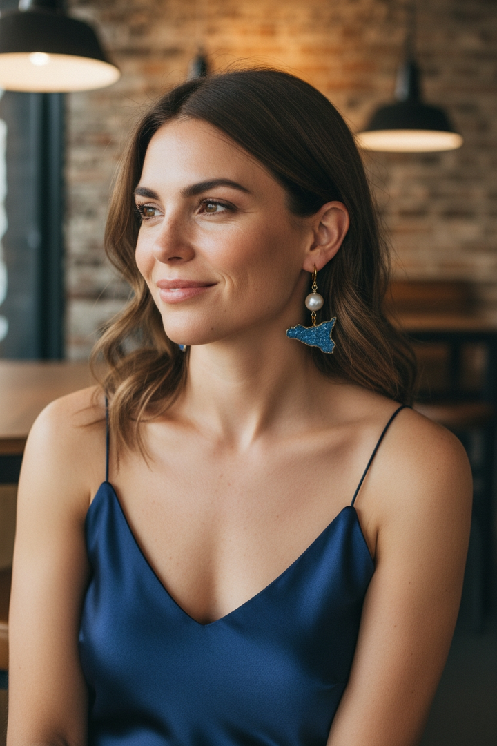 Orecchini in resina blu e perla di fiume bianca, lavorazione in resina effetto diamantato.