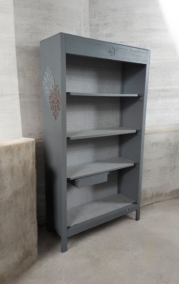 Mobile con ripiani adattato a libreria con un cassettino in uno dei ripiani.