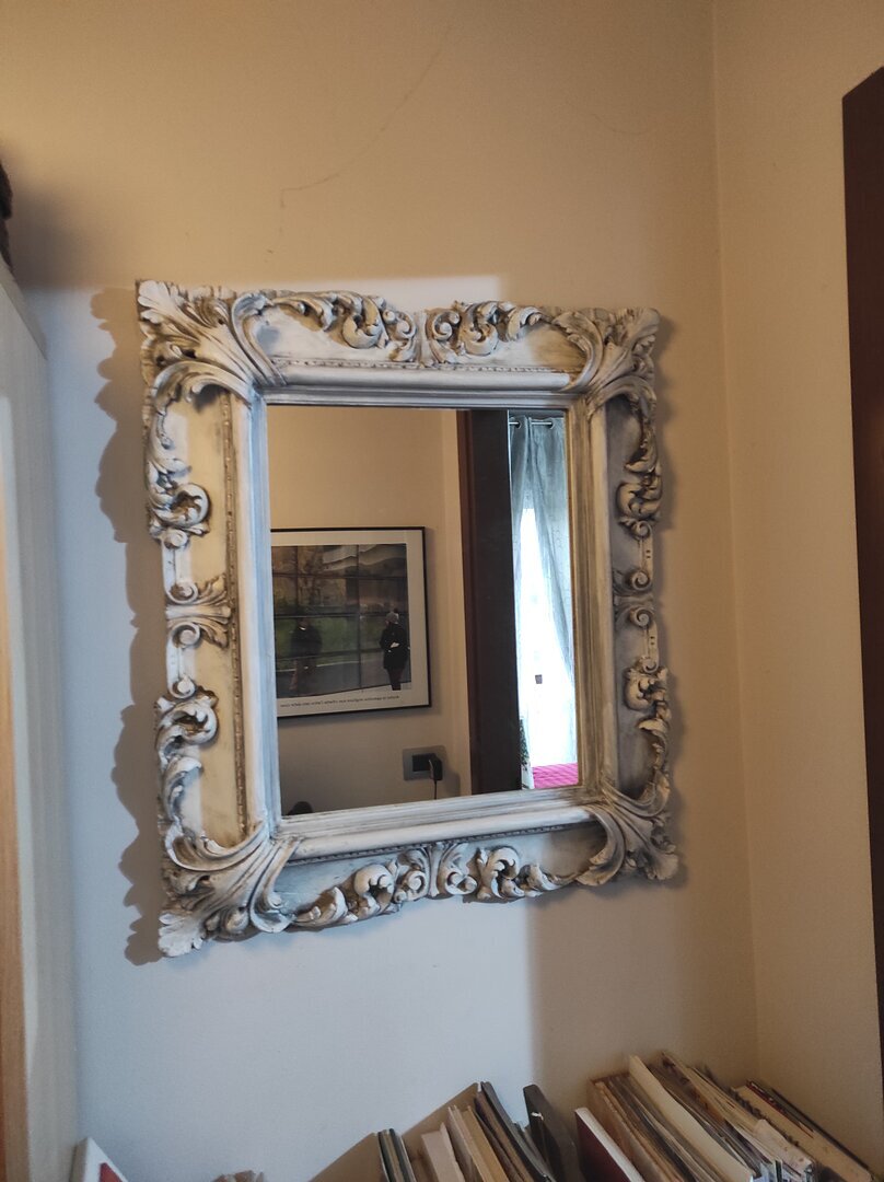 Splendido specchio in legno da ingresso, bagno o camera da letto realizzato nelle tonalità dei grigi (chiaro per la base, scuro per effetti di patinatura e profondità) che lascia incantati.