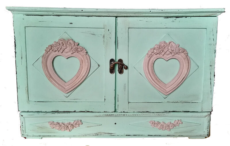 Deliziosa cassetta con doppia anta e cassettino in verde menta stile shabby chic.