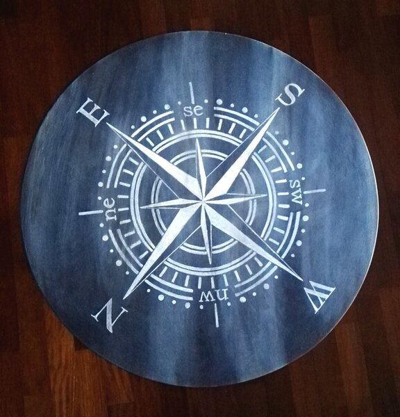 Il ripiano é decorato in blu navy e decorazione in bianco.