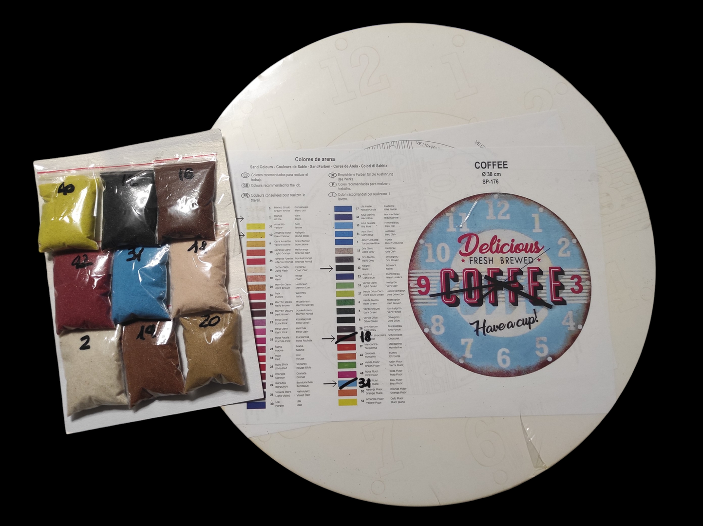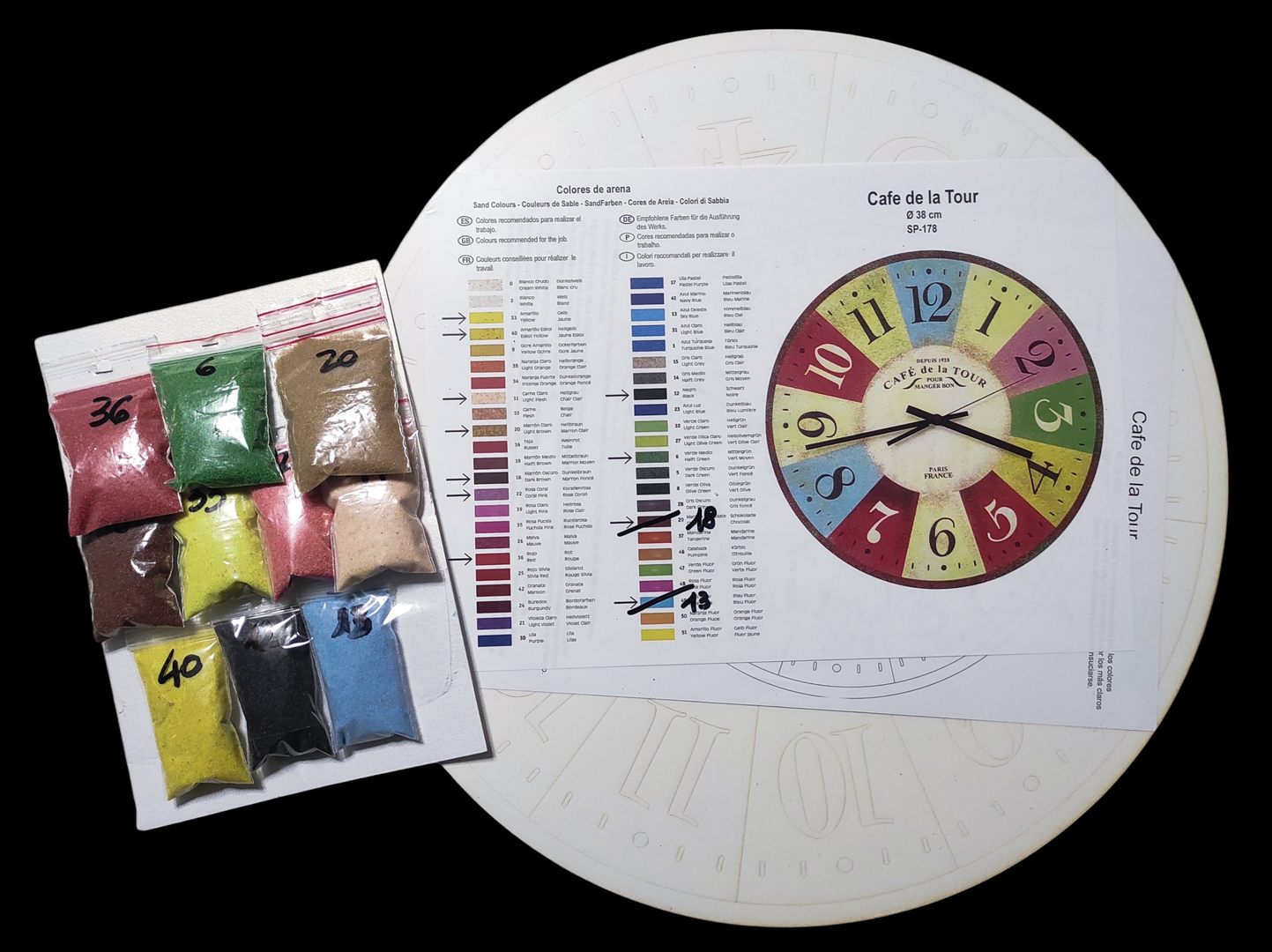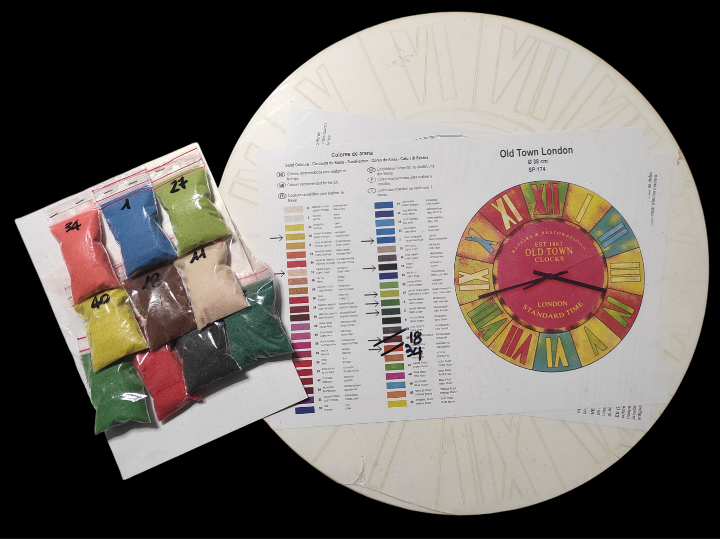 Kit costituito da base in legno di cm 38 c.ca di lato e disegno pretagliato del soggetto, un disegno in bianco e nero con tracciato numerato dei colori da utilizzare, un set dei colori per il riempimento degli spazi.