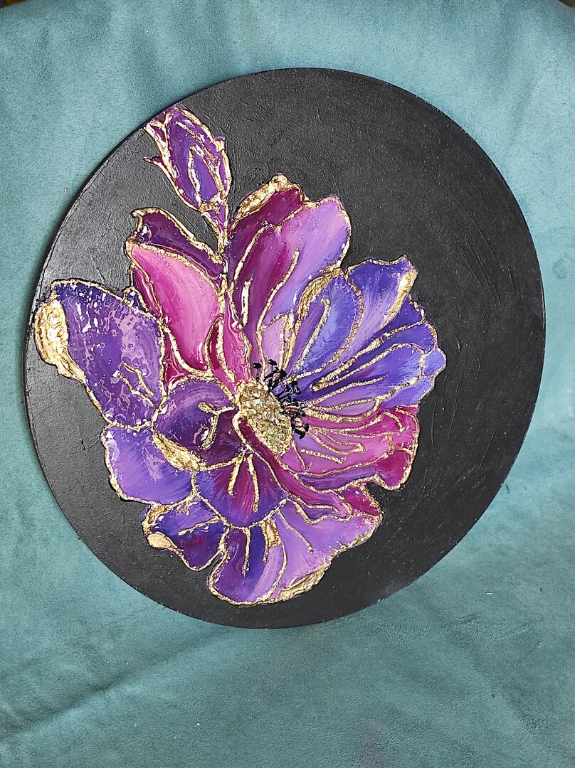 Lo sfondo nero crea il giusto contrasto per rendere ancora più evidente questo splendido fiore con centrale in pietruzze dorate e petali rifiniti in resina.