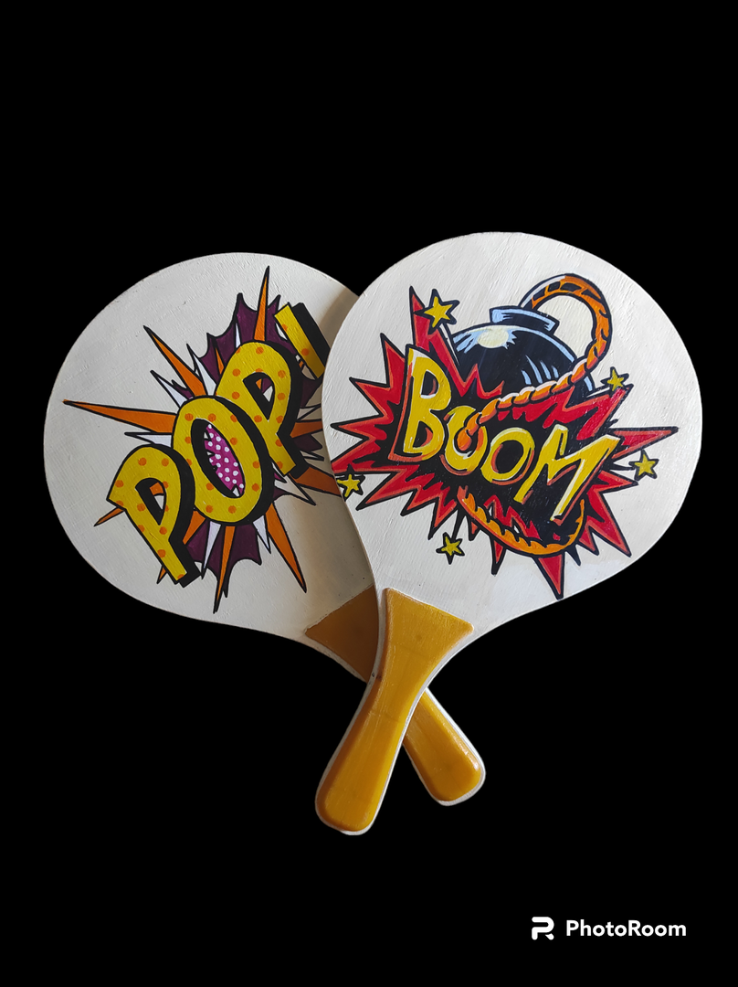 Coppia di racchettoni in stile pop art dipinti con le caratteristiche scritte in fronte/retro.