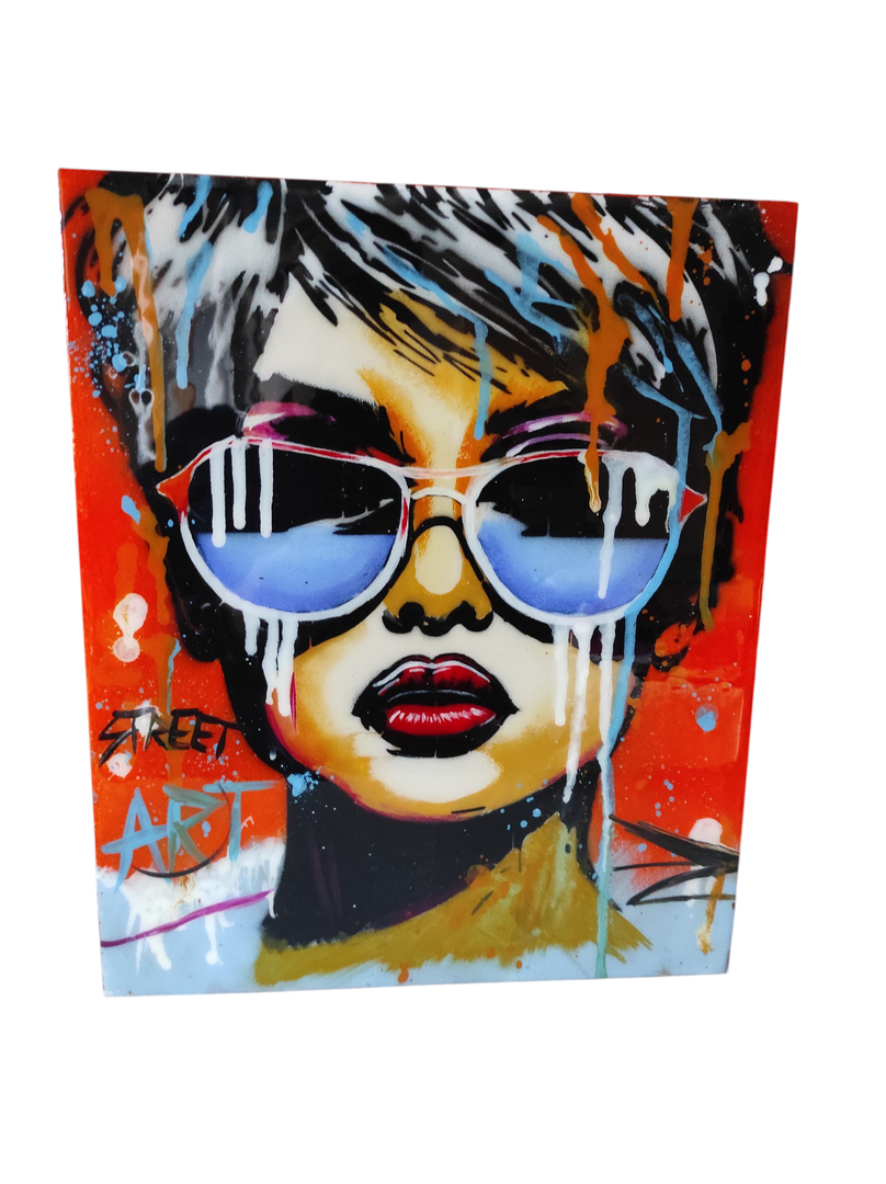 Pannello in legno con misure cm 27x32x1,5 di spessore, decorato con figura di Donna con occhiali da sole su fondo arancio. Di sicuro impatto, la figura femminile é un mix tra pop art e street art.