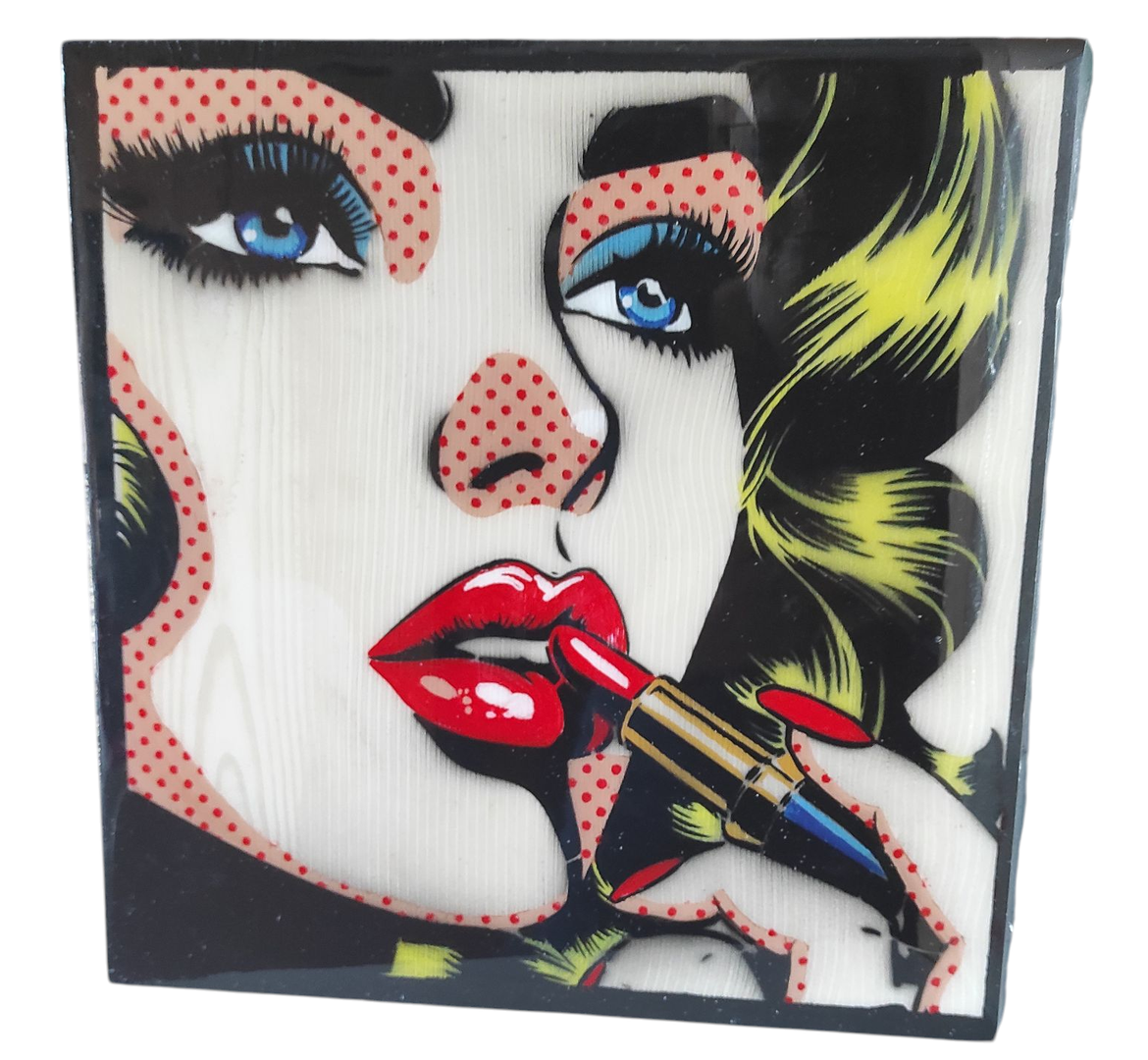 Pannello in legno di circa cm 30x29x1 con riprodotto il volto di una Donna intenta a indossare un rossetto rosso brillante, simbolo di energia, che spicca come elemento centrale.