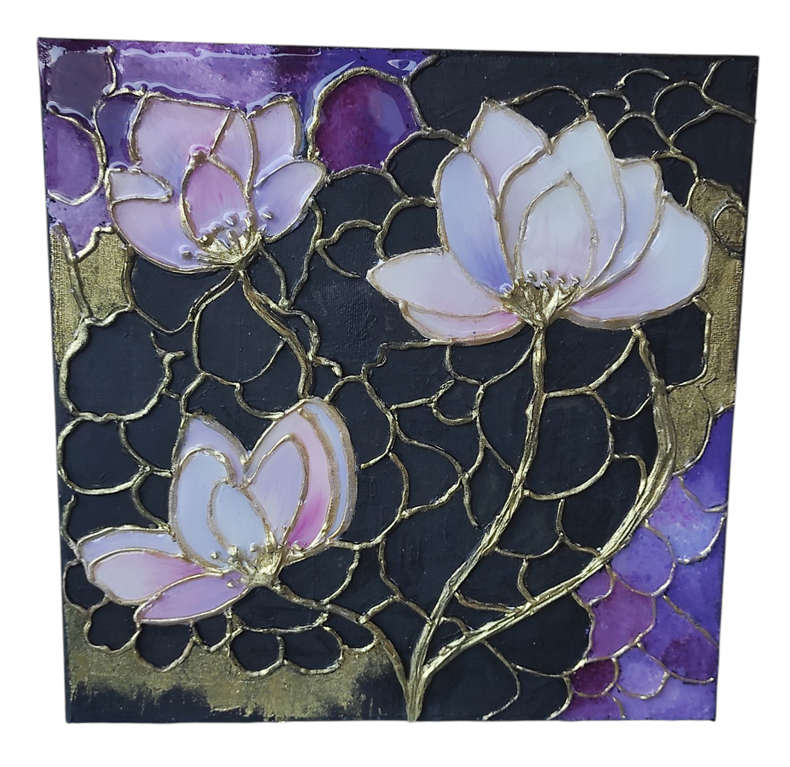 Tela quadrata con fiori di loto dai contorni tridimensionali realizzati in pasta materica.